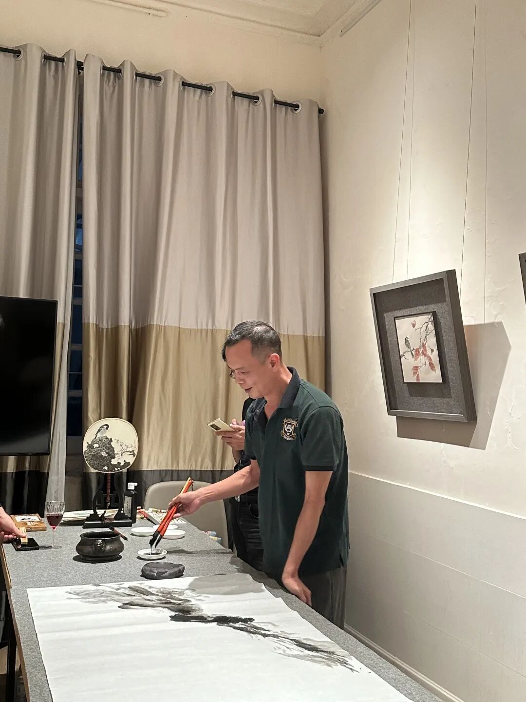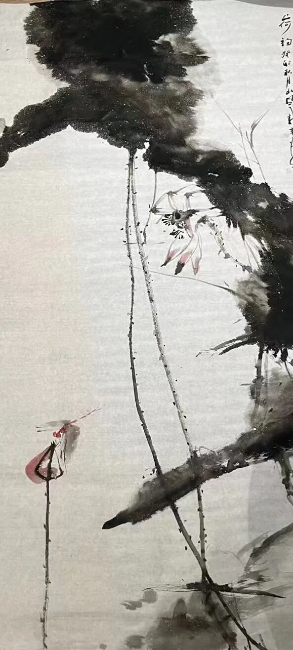 三杯又下肚后挥毫交流,郭青老师跟沈山风老师合作清荷。